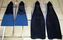 | Le matériel indispensable du nageur avec palmes est bien évidemment sa paire de bi-palmes tout en caoutchouc (1) ou en matériaux composites (2) et sa monopalme (plate ou à aillette). Ces dernières sont généralement fabriquées à l'aide de plaques, de fibre de verre superposé, munie de chaussons en caoutchouc.