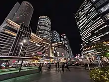 La gare de Nagoya est en superficie au sol la plus grande gare du monde. Au-dessus s'élèvent deux grandes tours abritant notamment le siège de la JR Central. La ligne Shinkansen Tōkaidō s'y arrête, ainsi que plusieurs lignes classiques. Elle est située à l'ouest du centre, dans l'axe de l'avenue Sakura[l 1].
