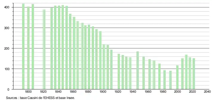 L'évolution du nombre d'habitants est connue à travers les recensements de la population effectués dans la commune depuis 1793. Pour les communes de moins de 10 000 habitants, une enquête de recensement portant sur toute la population est réalisée tous les cinq ans, les populations légales des années intermédiaires étant quant à elles estimées par interpolation ou extrapolation[15]. Pour la commune, le premier recensement exhaustif entrant dans le cadre du nouveau dispositif a été réalisé en 2006[16].