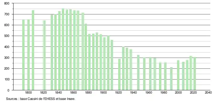 L'évolution du nombre d'habitants est connue à travers les recensements de la population effectués dans la commune depuis 1793. Pour les communes de moins de 10 000 habitants, une enquête de recensement portant sur toute la population est réalisée tous les cinq ans, les populations légales des années intermédiaires étant quant à elles estimées par interpolation ou extrapolation[17]. Pour la commune, le premier recensement exhaustif entrant dans le cadre du nouveau dispositif a été réalisé en 2006[18].