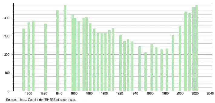 L'évolution du nombre d'habitants est connue à travers les recensements de la population effectués dans la commune depuis 1793. Pour les communes de moins de 10 000 habitants, une enquête de recensement portant sur toute la population est réalisée tous les cinq ans, les populations légales des années intermédiaires étant quant à elles estimées par interpolation ou extrapolation[21]. Pour la commune, le premier recensement exhaustif entrant dans le cadre du nouveau dispositif a été réalisé en 2007[22].