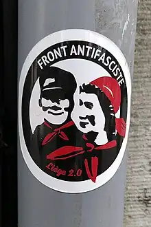- sa sculpture, trinquant avec son galant, se trouve aussi devant le no 35 de la rue Grande-Bêche en Outremeuse[5].