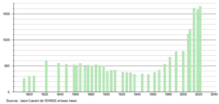 L'évolution du nombre d'habitants est connue à travers les recensements de la population effectués dans la commune depuis 1793. Pour les communes de moins de 10 000 habitants, une enquête de recensement portant sur toute la population est réalisée tous les cinq ans, les populations légales des années intermédiaires étant quant à elles estimées par interpolation ou extrapolation[18]. Pour la commune, le premier recensement exhaustif entrant dans le cadre du nouveau dispositif a été réalisé en 2008[19].