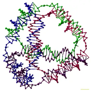 La nanotechnologie en ADN est la conception et fabrication de structures en acide nucléique artificiel en tant que composantes de structures naines au lieu des porteurs de gènes dans les cellules vivantes. L'ADN se prête à cette utilisation parce qu'elle respecte un strict appariement de ses bases nucléiques pour former des doubles hélices fortes et solides. Cette caractéristique[1] permet une conception rationnelle de séquences de base qui s'assembleront pour former des structures à l'échelle naine dotées des particularités visées. L'ADN est le matériau prédominant, mais on s'est servi d'autres acides nucléiques tels que l'ARN[2],[3] et l'ANP (acide nucléique peptidique), d'où l'appellation possible de nanotechnologie en acide nucléique pour décrire ce domaine.