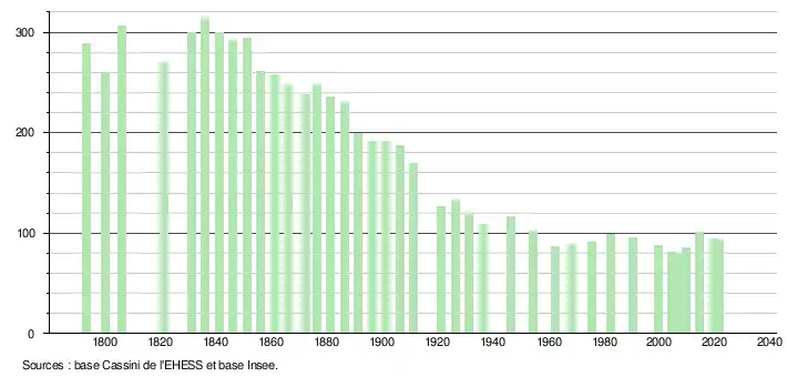 L'évolution du nombre d'habitants est connue à travers les recensements de la population effectués dans la commune depuis 1793. Pour les communes de moins de 10 000 habitants, une enquête de recensement portant sur toute la population est réalisée tous les cinq ans, les populations légales des années intermédiaires étant quant à elles estimées par interpolation ou extrapolation[22]. Pour la commune, le premier recensement exhaustif entrant dans le cadre du nouveau dispositif a été réalisé en 2004[23].