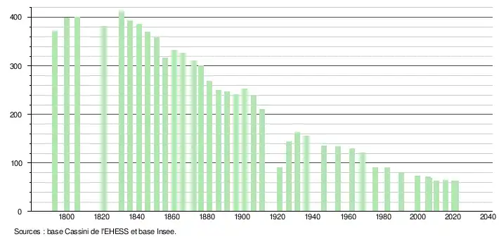 L'évolution du nombre d'habitants est connue à travers les recensements de la population effectués dans la commune depuis 1793. Pour les communes de moins de 10 000 habitants, une enquête de recensement portant sur toute la population est réalisée tous les cinq ans, les populations légales des années intermédiaires étant quant à elles estimées par interpolation ou extrapolation[15]. Pour la commune, le premier recensement exhaustif entrant dans le cadre du nouveau dispositif a été réalisé en 2005[16].