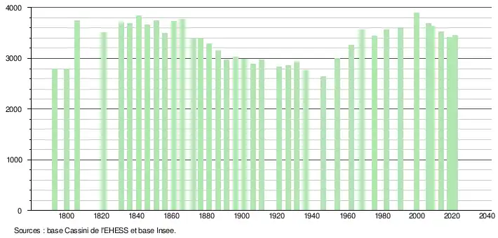 L'évolution du nombre d'habitants est connue à travers les recensements de la population effectués dans la commune depuis 1793. Pour les communes de moins de 10 000 habitants, une enquête de recensement portant sur toute la population est réalisée tous les cinq ans, les populations légales des années intermédiaires étant quant à elles estimées par interpolation ou extrapolation[35]. Pour la commune, le premier recensement exhaustif entrant dans le cadre du nouveau dispositif a été réalisé en 2008[36].