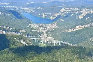 D'autre part, l'autoroute A40 traverse la commune par le biais du viaduc de Nantua. Cet ouvrage imposant constitué de plusieurs piliers a été ouvert en 1990. L'entrée pour l'autoroute n'est pas située sur la commune, mais sur la commune voisine des Neyrolles.