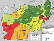 Autre point de comparaison issu de l'ONUDC, d'après ses rapports opium survey 2001[29] et Afghanistan Opium Survey 2007[30], la surface cultivée en pavot est passée de 7 606 ha en 2001 (dont plus de 80 %, 6 342 ha, dans la province du Badakhshan, celle qui était à l'époque principalement contrôlée par l'Alliance du Nord), à 197 000 ha en 2007 (dont 70 % dans cinq provinces du Sud-Ouest bordant le Pakistan, principalement celle de Helmand). Ceci représente une multiplication par 26 de la surface cultivée entre la dernière année du régime des talibans et 2006.