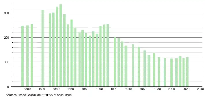 L'évolution du nombre d'habitants est connue à travers les recensements de la population effectués dans la commune depuis 1793. Pour les communes de moins de 10 000 habitants, une enquête de recensement portant sur toute la population est réalisée tous les cinq ans, les populations légales des années intermédiaires étant quant à elles estimées par interpolation ou extrapolation[43]. Pour la commune, le premier recensement exhaustif entrant dans le cadre du nouveau dispositif a été réalisé en 2006[44].