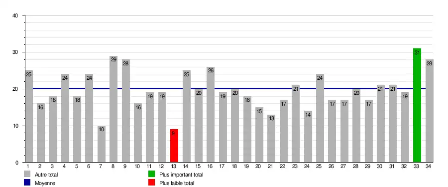 | Sète | 14 | 7 | 14 | 15 | 16 | 14 | 16 | 14 | 13 | 10 | 9 | 11 | 7 | 10 | 10 | 12 | 13 | 14 | 14 | 13 | 14 | 14 | 13 | 15 | 12 | 10 | 13 | 13 | 13 | 12 | 11 | 9 | 9 | 11 | 4 | |