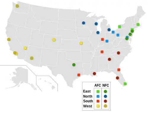 Depuis 1970, la NFL est organisée en deux conférences : la National Football Conference et l'American Football Conference, elles-mêmes subdivisées en quatre divisions : Est, Ouest, Nord et Sud[15]. La répartition des équipes au sein de ces divisions n'est cependant pas toujours cohérente avec leur positionnement géographique : les Cowboys de Dallas évoluent par exemple au sein de la NFC Est. Le découpage institué par la NFL permet d'organiser un championnat structuré avec un nombre de matchs relativement réduit : à cause du niveau d'engagement physique et du nombre d'équipes en NFL, il serait difficilement envisageable d'organiser un championnat à poule unique comme à l'origine.