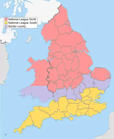 Générale![]() La zone couverte par la National League North est colorée en rouge. Les équipes de la National League North peuvent provenir également de comtés limitrophes de la National League South (violet). |