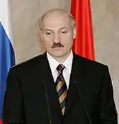 L'élection présidentielle biélorusse de 1994 a marqué un conflit important entre les groupes nationalistes pro-russes et pro-occidentaux. Dans le premier camp se trouvait Alexandre Loukachenko, un gestionnaire agricole collectif de l'est du pays. Dans le dernier se trouvaient Pazniak et Chouchkievitch[31]. Loukachenko a remporté les élections et s'est rapidement mis à renverser la tendance à la biéloranisation menée par le gouvernement de 1991 à 1994. En 1995, Loukachenko a organisé un référendum pour établir le russe comme langue co-officielle avec le biélorusse et rétablir les symboles de la RSS de Biélorussie. Le référendum a été un succès avec 64,8 % de participation, bien que les résultats aient été largement condamnés comme étant truqués par l'opposition et l'Organisation pour la sécurité et la coopération en Europe (OSCE). De son côté, Loukachenko a affirmé qu'il n'était pas impliqué dans la russification, accusant au contraire Macherov[31].