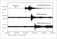 À 11 h 29 min 34 s (7 h 29 min 50 s UTC), les détecteurs sismiques du Réseau de surveillance sismique norvégien (NORSAR) et d'autres stations de par le monde enregistrent une explosion d'une magnitude de 1,5 sur l'échelle de Richter[17]. La localisation de l'explosion est estimée à 69° 38′ N, 37° 19′ E, au nord-est de Mourmansk, à environ 250 km de la Norvège et 80 km de la péninsule de Kola[18].
