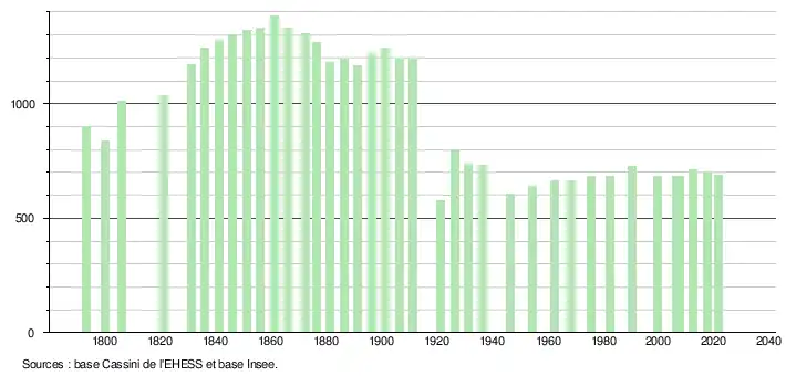 L'évolution du nombre d'habitants est connue à travers les recensements de la population effectués dans la commune depuis 1793. Pour les communes de moins de 10 000 habitants, une enquête de recensement portant sur toute la population est réalisée tous les cinq ans, les populations légales des années intermédiaires étant quant à elles estimées par interpolation ou extrapolation[29]. Pour la commune, le premier recensement exhaustif entrant dans le cadre du nouveau dispositif a été réalisé en 2007[30].