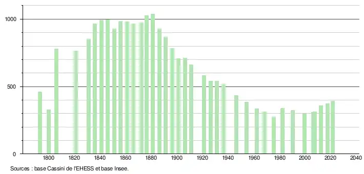 L'évolution du nombre d'habitants est connue à travers les recensements de la population effectués dans la commune depuis 1793. Pour les communes de moins de 10 000 habitants, une enquête de recensement portant sur toute la population est réalisée tous les cinq ans, les populations légales des années intermédiaires étant quant à elles estimées par interpolation ou extrapolation[45]. Pour la commune, le premier recensement exhaustif entrant dans le cadre du nouveau dispositif a été réalisé en 2007[46].