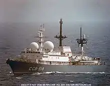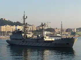 - des bâtiments ELINT (pour electronic intelligence) pour l'interception, analyse et goniométrie des émissions électroniques autres que radio (interception des ondes radar)