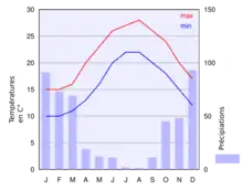 | Température moyenne (°C) | 10 | 11 | 14 | 16 | 20 | 23 | 26 | 26 | 24 | 20 | 16 | 14 | 18,3 |