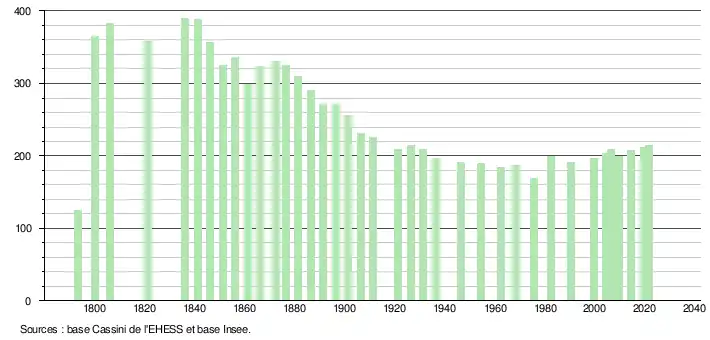 L'évolution du nombre d'habitants est connue à travers les recensements de la population effectués dans la commune depuis 1793. Pour les communes de moins de 10 000 habitants, une enquête de recensement portant sur toute la population est réalisée tous les cinq ans, les populations légales des années intermédiaires étant quant à elles estimées par interpolation ou extrapolation[23]. Pour la commune, le premier recensement exhaustif entrant dans le cadre du nouveau dispositif a été réalisé en 2004[24].
