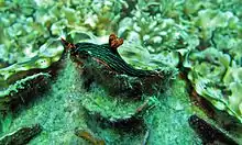 Elle peut atteindre une longueur de plus de 12 cm. De couleur noire, elle porte des rayures vertes sur toute la longueur du corps ou des excroissances vertes. Le bord du pied et de la tête est rouge vif orangé. Les rhinophores et les branchies non rétractiles situées sur son dos[3] peuvent être rouge ou verte. Elle est facilement confondue avec une espèce similaire, Nembrotha cristata mais cette dernière n'a pas de bordure rouge orange sur le pied.