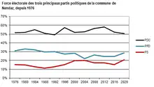 Les résultats des élections communales d'octobre 2020 permettent d'indiquer la force respective des partis politiques de Nendaz : Parti démocrate-chrétien : 50,5 %, Parti libéral-radical : 28,6 %, Parti socialiste : 20,9 %. Nendaz compte aussi une section de l'Union démocratique du centre (UDC). Présente pour la première fois à l'occasion des élections communales de 2004, l'UDC recueille 5,1 % des suffrages. En 2008, le parti socialiste de Nendaz s'allie aux Verts et se présente aux élections du Conseil communal sous la dénomination « Alliance de gauche ». À l'exception de la législature 1957-1960, le PDC a toujours détenu la majorité absolue des sièges du Conseil communal[12]. En 1988 et 1992, un membre du Parti d'entente communale (divers droite) obtient un siège au Conseil communal.