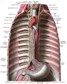 Dans le thorax, le nerf vague chemine dans le médiastin, toujours vers le bas. Les rapports et le trajet ne sont pas les mêmes à gauche et à droite, en partie du fait de l'asymétrie de conformation vasculaire du médiastin.