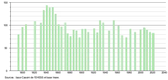 L'évolution du nombre d'habitants est connue à travers les recensements de la population effectués dans la commune depuis 1793. Pour les communes de moins de 10 000 habitants, une enquête de recensement portant sur toute la population est réalisée tous les cinq ans, les populations légales des années intermédiaires étant quant à elles estimées par interpolation ou extrapolation[26]. Pour la commune, le premier recensement exhaustif entrant dans le cadre du nouveau dispositif a été réalisé en 2005[27].