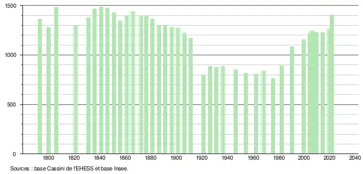 L'évolution du nombre d'habitants est connue à travers les recensements de la population effectués dans la commune depuis 1793. Pour les communes de moins de 10 000 habitants, une enquête de recensement portant sur toute la population est réalisée tous les cinq ans, les populations légales des années intermédiaires étant quant à elles estimées par interpolation ou extrapolation[37]. Pour la commune, le premier recensement exhaustif entrant dans le cadre du nouveau dispositif a été réalisé en 2004[38].