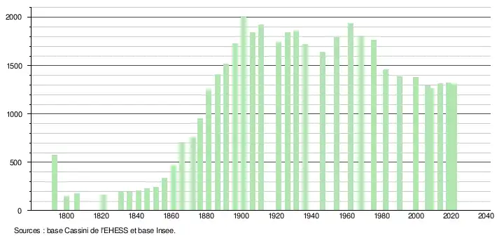 L'évolution du nombre d'habitants est connue à travers les recensements de la population effectués dans la commune depuis 1793. Pour les communes de moins de 10 000 habitants, une enquête de recensement portant sur toute la population est réalisée tous les cinq ans, les populations légales des années intermédiaires étant quant à elles estimées par interpolation ou extrapolation[24]. Pour la commune, le premier recensement exhaustif entrant dans le cadre du nouveau dispositif a été réalisé en 2008[25].