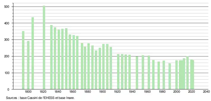 L'évolution du nombre d'habitants est connue à travers les recensements de la population effectués dans la commune depuis 1793. Pour les communes de moins de 10 000 habitants, une enquête de recensement portant sur toute la population est réalisée tous les cinq ans, les populations légales des années intermédiaires étant quant à elles estimées par interpolation ou extrapolation[23]. Pour la commune, le premier recensement exhaustif entrant dans le cadre du nouveau dispositif a été réalisé en 2004[24].