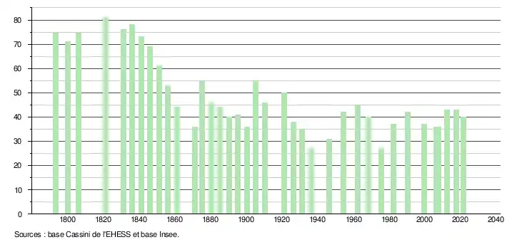 L'évolution du nombre d'habitants est connue à travers les recensements de la population effectués dans la commune depuis 1793. Pour les communes de moins de 10 000 habitants, une enquête de recensement portant sur toute la population est réalisée tous les cinq ans, les populations légales des années intermédiaires étant quant à elles estimées par interpolation ou extrapolation[15]. Pour la commune, le premier recensement exhaustif entrant dans le cadre du nouveau dispositif a été réalisé en 2007[16].