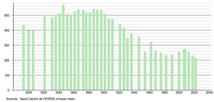 L'évolution du nombre d'habitants est connue à travers les recensements de la population effectués dans la commune depuis 1793. Pour les communes de moins de 10 000 habitants, une enquête de recensement portant sur toute la population est réalisée tous les cinq ans, les populations légales des années intermédiaires étant quant à elles estimées par interpolation ou extrapolation[14]. Pour la commune, le premier recensement exhaustif entrant dans le cadre du nouveau dispositif a été réalisé en 2007[15].