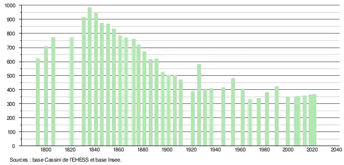 L'évolution du nombre d'habitants est connue à travers les recensements de la population effectués dans la commune depuis 1793. Pour les communes de moins de 10 000 habitants, une enquête de recensement portant sur toute la population est réalisée tous les cinq ans, les populations légales des années intermédiaires étant quant à elles estimées par interpolation ou extrapolation[17]. Pour la commune, le premier recensement exhaustif entrant dans le cadre du nouveau dispositif a été réalisé en 2008[18].