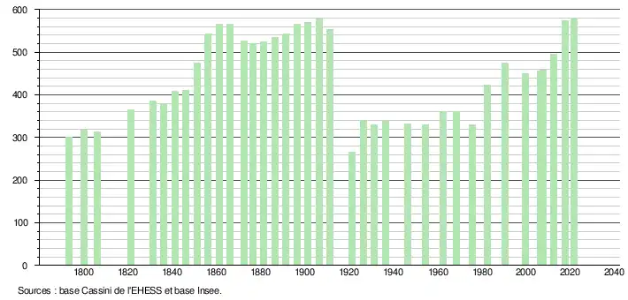 L'évolution du nombre d'habitants est connue à travers les recensements de la population effectués dans la commune depuis 1793. Pour les communes de moins de 10 000 habitants, une enquête de recensement portant sur toute la population est réalisée tous les cinq ans, les populations légales des années intermédiaires étant quant à elles estimées par interpolation ou extrapolation[23]. Pour la commune, le premier recensement exhaustif entrant dans le cadre du nouveau dispositif a été réalisé en 2007[24].