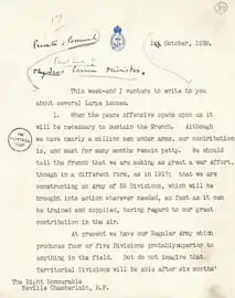 Les premiers budgets de Chamberlain voyaient une coupe massive dans les dépenses militaires[51]. À partir de 1935, face à une Allemagne en renouveau, il est convaincu de la nécessité du réarmement[52]. Il soutient notamment le renforcement de la Royal Air Force, comprenant que la Manche, protection traditionnelle de l’Angleterre, ne suffira pas contre des attaques aériennes[53].