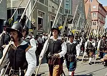 Les piquiers doivent présenter aux cavaliers ennemis une forêt impénétrable de piques de façon à protéger les mousquetaires, très vulnérables pendant le rechargement de leurs armes. Les mousquetaires eux, sont censés maintenir un feu constant, par « contremarche », une technique par laquelle les unités tirent en volées successives : chaque soldat du premier rang tire puis se retire vers l'arrière de la formation, composée généralement de six rangées, tout en rechargeant son arme et ainsi de suite. En combat rapproché, les mousquetaires n'ont souvent pas le temps de recharger ; dès lors les infanteries ennemies s'engagent l'une l'autre par la « poussée de la pique », le choc frontal de deux unités de piquiers, tandis que les mousquetaires se joignent à la mêlée en utilisant la crosse de leurs armes comme des massues.