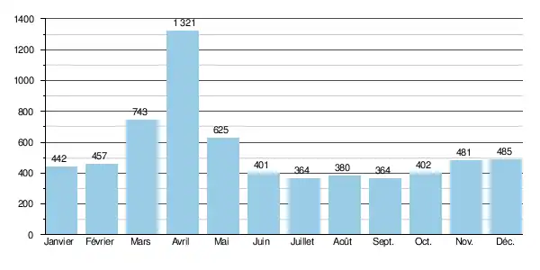Le débit moyen mensuel observé en mars (minimum d'étiage) est de 364 m3/s, soit plus du quart du débit moyen du mois d'avril (1 321 m3/s), ce qui témoigne de l'amplitude assez modérée des variations saisonnières. Sur la durée d'observation de 170 ans, le débit mensuel minimal a été de 184 m3/s (août 1969), tandis que le débit mensuel maximal s'élevait à 3 310 m3/s (avril 1958). Un débit mensuel inférieur à 200 m3/s est tout à fait exceptionnel.