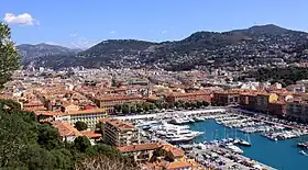 Le pourtour du port Lympia, la place de l'île de Beauté, avec le mont Gros (Observatoire) et le mont Vinaigrier à l'est de Nice (en arrière-plan à droite, la tour hertzienne du mont Leuze à Villefranche-sur-Mer)