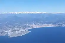 Nice vue d'avion : au premier plan, l'aéroport à gauche, l'agglomération à droite avec la promenade des Anglais et en fond de tableau, le Mercantour enneigé.