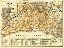 La ville est située face à la baie des Anges, abritée du vent par un amphithéâtre de collines, dans une étroite cuvette montagneuse adossée au massif du Mercantour, limitée à l'ouest par la vallée du Var et à l'est par le mont Boron. Le premier site de Nice fut la colline du Château qui fut entièrement militarisé avant d'être détruit par Louis XIV. Nice s'est développée au pied de cette colline en se limitant à la partie comprise entre le Paillon et la mer et qui constitue aujourd'hui le Vieux-Nice aux ruelles étroites. C'est surtout après le rattachement à la France que la ville s'est étendue au-delà de ce cours d'eau qui est aujourd'hui partiellement couvert.
