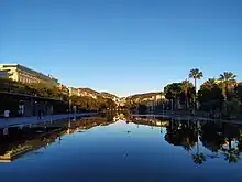Elle est délimitée par le fleuve Var à l'ouest et le mont Boron à l'est. Elle est traversée du nord au sud par le Magnan[18], ainsi qu'à l'est par le Paillon[19] qui conflue avec la Banquière[20], sous l'autoroute A8, juste en bas du vallon de la Lauvette et du quartier de l'Ariane, au nord-est de Nice.