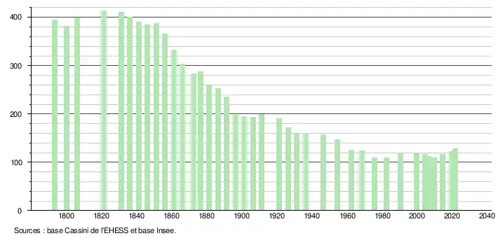L'évolution du nombre d'habitants est connue à travers les recensements de la population effectués dans la commune depuis 1793. Pour les communes de moins de 10 000 habitants, une enquête de recensement portant sur toute la population est réalisée tous les cinq ans, les populations légales des années intermédiaires étant quant à elles estimées par interpolation ou extrapolation[15]. Pour la commune, le premier recensement exhaustif entrant dans le cadre du nouveau dispositif a été réalisé en 2004[16].