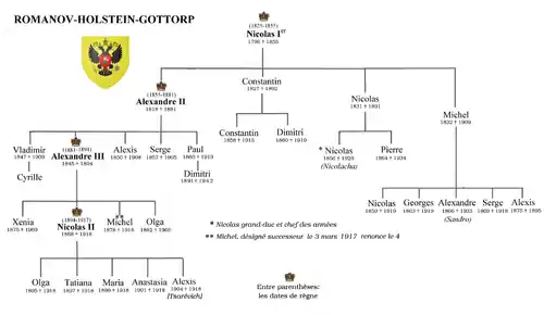 Nicolas Ier de Russie appartient à la première branche de la maison d'Oldenbourg-Russie (Holstein-Gottorp-Romanov) issue de la première branche de la maison d'Holstein-Gottorp, elle-même issue de la première branche de la maison d'Oldenbourg. Il est l'ascendant de deux princes se disputant la primatie de la maison impériale de Russie à ce jour le prince Andreï Andreïevitch de Russie et la princesse Maria Vladimirovna de Russie, mère du prince Georges de Hohenzollern.