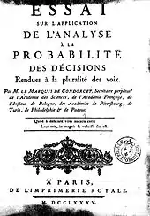 Dans de nombreux ouvrages (Essai sur l’application de l’analyse à la probabilité des décisions rendues à la pluralité des voix de 1785 - Essai sur la constitution et les fonctions des assemblées provinciales - Sur les élections), Condorcet s’intéresse à la représentativité des systèmes de vote, tant dans le cadre politique que dans le cadre judiciaire : l'essai de 1785 ne concerne pas tant le vote politique que le délibéré d'un jury, puisqu'il insiste sur le caractère correct, c'est-à-dire vrai ou faux, de la décision finale — il ne s'agit donc pas de déterminer une préférence (pour tel ou tel candidat) mais un fait (untel a-t-il commis tel crime ? ). Partant de l'hypothèse d'une très légère propension de l'homme de la rue à juger en accord avec les faits plutôt que de façon erronée, il démontre que plus il y a de votants, plus les chances que le résultat du vote aboutisse à une décision correcte sont importantes. Cette démonstration mathématique soutient sa préférence, en matière pénale, pour le jury populaire plutôt que pour les magistrats individuels.