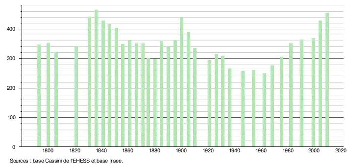 L'évolution du nombre d'habitants est connue à travers les recensements de la population effectués dans la commune depuis 1793. À partir du , les populations légales des communes sont publiées annuellement dans le cadre d'un recensement qui repose désormais sur une collecte d'information annuelle, concernant successivement tous les territoires communaux au cours d'une période de cinq ans. Pour les communes de moins de 10 000 habitants, une enquête de recensement portant sur toute la population est réalisée tous les cinq ans, les populations légales des années intermédiaires étant quant à elles estimées par interpolation ou extrapolation[5]. Pour la commune, le premier recensement exhaustif entrant dans le cadre du nouveau dispositif a été réalisé en 2004[6],[Note 1].
