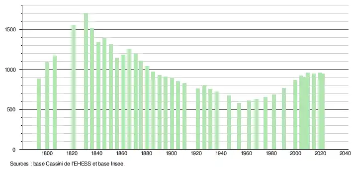 L'évolution du nombre d'habitants est connue à travers les recensements de la population effectués dans la commune depuis 1793. Pour les communes de moins de 10 000 habitants, une enquête de recensement portant sur toute la population est réalisée tous les cinq ans, les populations légales des années intermédiaires étant quant à elles estimées par interpolation ou extrapolation[18]. Pour la commune, le premier recensement exhaustif entrant dans le cadre du nouveau dispositif a été réalisé en 2004[19].