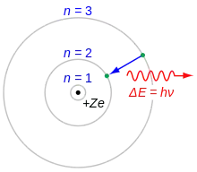 Bohr introduit dans son modèle la notion d'état stationnaire, état déterminé dans lequel l'électron qui orbite autour du noyau atomique n'émet ou n'absorbe aucune quantité d'énergie[9]. Son idée fondamentale est que le rayonnement énergétique n’est pas émis ou absorbé de manière continue, comme le suppose l’électrodynamique classique, mais correspond au passage du système atomique vers différents états eux-mêmes stationnaires. Le rayonnement électromagnétique se réalise alors comme si les électrons « sautaient » d’une trajectoire stable à une autre : ils émettent une quantité d'énergie quand ils sautent d'un état stationnaire à un autre dont l'énergie est plus faible et absorbent une quantité d'énergie équivalente quand ils reviennent à leur état initial, ou quand ils sautent d'un état stationnaire à un autre dont l'énergie est plus élevée.