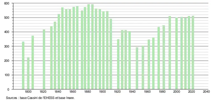 L'évolution du nombre d'habitants est connue à travers les recensements de la population effectués dans la commune depuis 1793. Pour les communes de moins de 10 000 habitants, une enquête de recensement portant sur toute la population est réalisée tous les cinq ans, les populations légales des années intermédiaires étant quant à elles estimées par interpolation ou extrapolation[23]. Pour la commune, le premier recensement exhaustif entrant dans le cadre du nouveau dispositif a été réalisé en 2006[24].