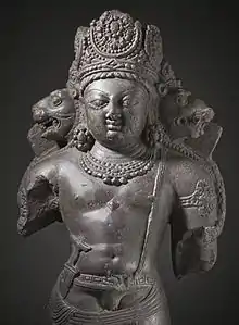 Cette double évocation laisse supposer qu’à l’origine Nīlakaṇṭha était Harihara, divinité combinant les caractéristiques de Vishnu-Hari (la moitié gauche), et de Shiva-Hara (la moitié droite), combinaison qui par la suite a été assimilée par le bouddhisme[24],[25],[26],[27].